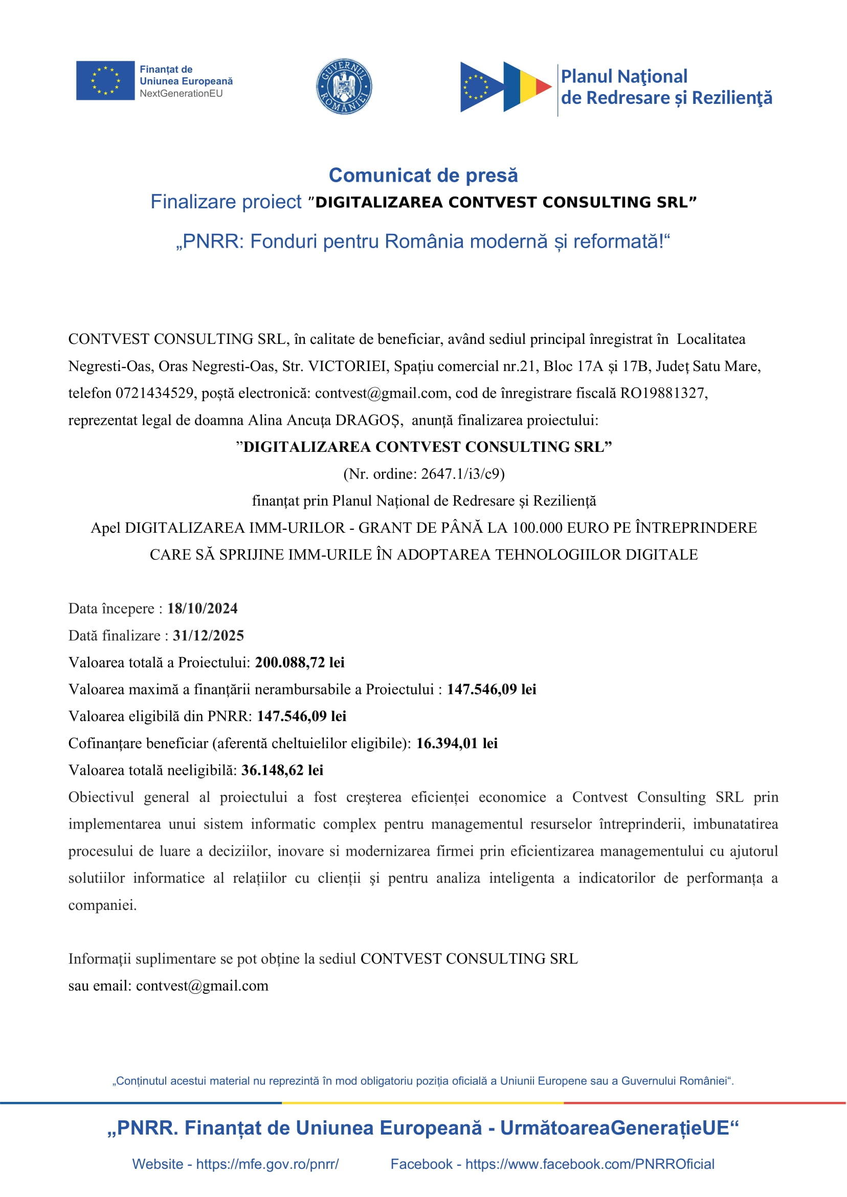 • Comunicat de presă – Finalizare proiect ”DIGITALIZAREA CONTVEST CONSULTING SRL” 30/12/2025