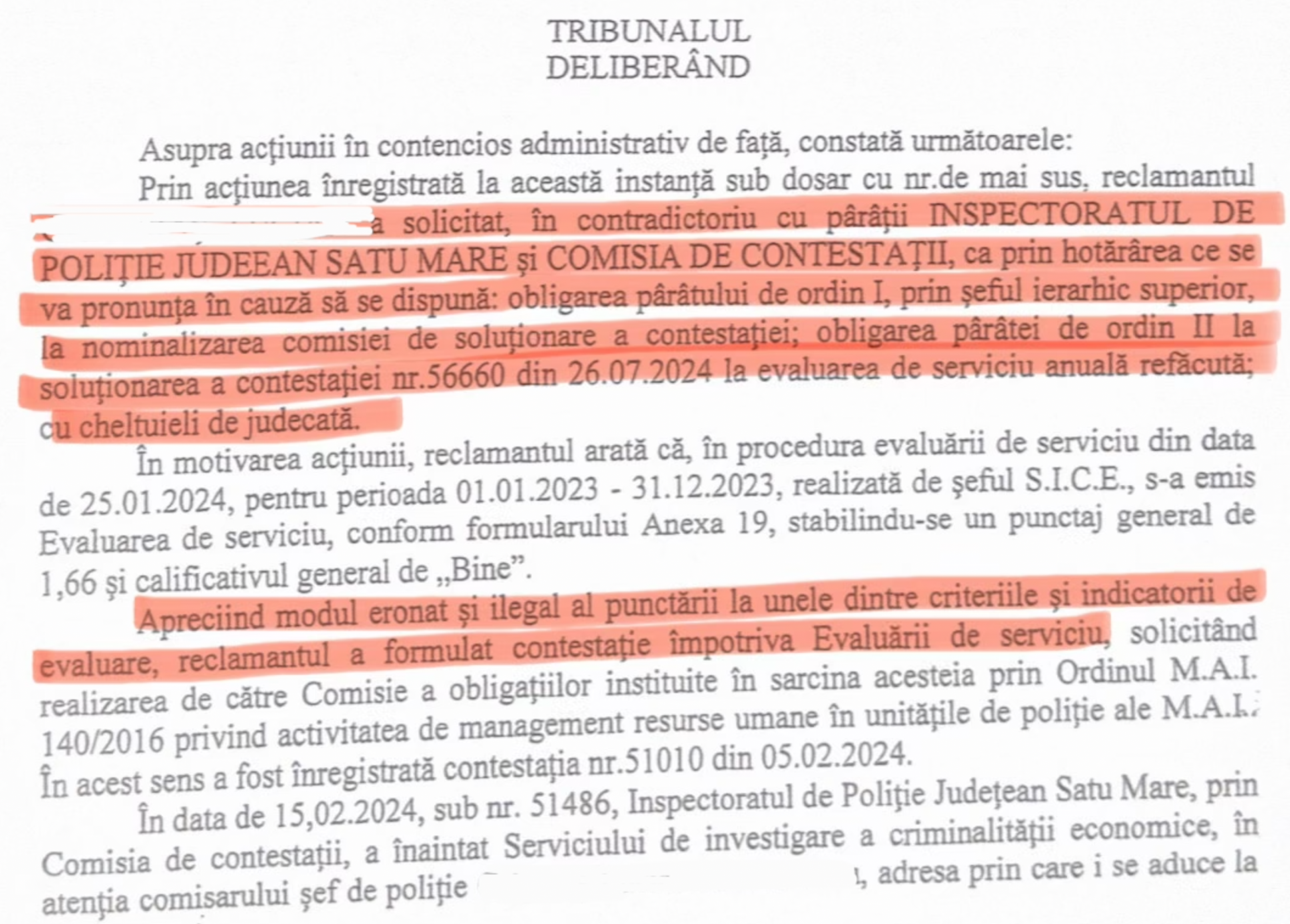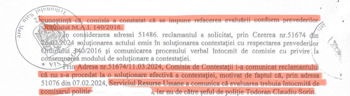 Deși comisia de soluționare a contestațiilor ar fi constatat încălcarea procedurii prevăzute de OMAI nr. 140/2016, aceasta nu a anulat evaluarea, solicitând doar reluarea procedurii, fapt considerat de sindicat drept o tentativă de mușamalizare. În lipsa unei soluții interne, ofițerul a deschis acțiune în instanță împotriva IPJ Satu Mare.
