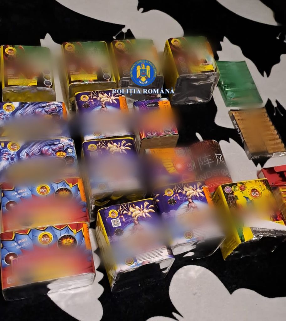 În urma percheziției, la domiciliul tânărului de 19 ani, din localitatea Căuaș au fost identificate peste 35 kg de articole pirotehnice deținute fără drept din categoria F2.