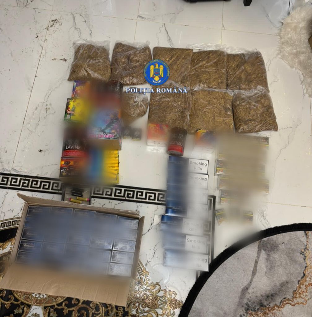La domiciliul bărbatului de 32 de ani, din localitatea Căuaș, polițiștii au identificat și ridicat în vederea confiscării cantitatea de aproximativ 57 kg de tutun, peste 12.000 de fire țigarete, cât și 250 de articole de îmbrăcăminte și încălțăminte având inscripționate mărci diferite, suspecte a fi contrafăcute, fiecare articol purtând o marcă identică cu o marcă înregistrată. De asemenea a fost ridicată suma de peste 4.000 lei.