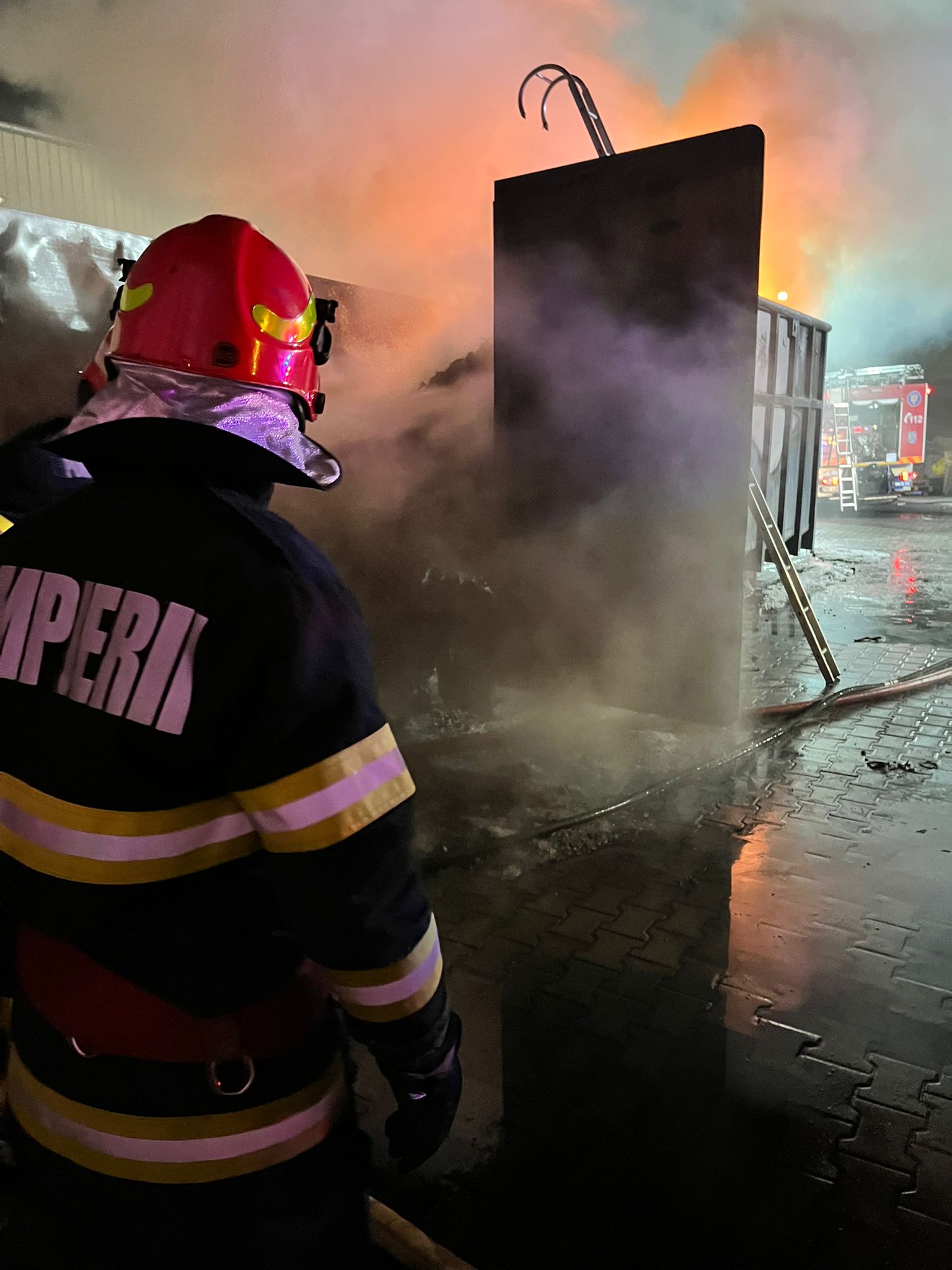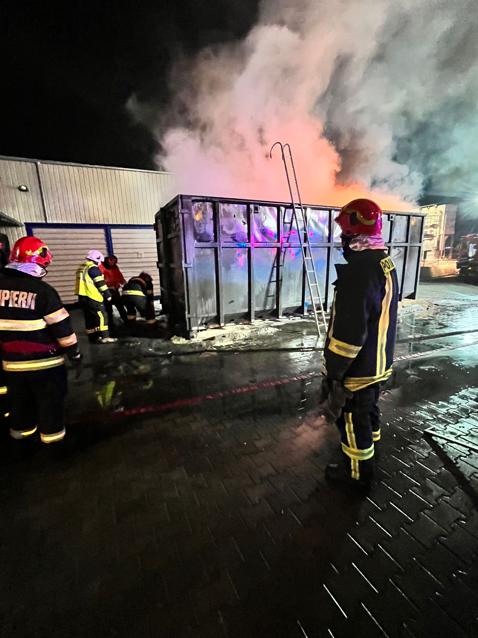 Incendiul a fost localizat și lichidat, acesta manifestându-se la un container cu deșeuri de cauciuc.