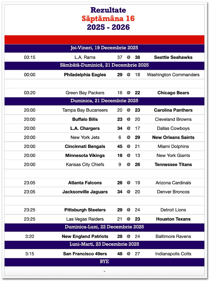 Text: Victor BanuThe post NFL Endzone – Retrospectivă săptămâna 16 first appeared on Observatorul Buzoian.