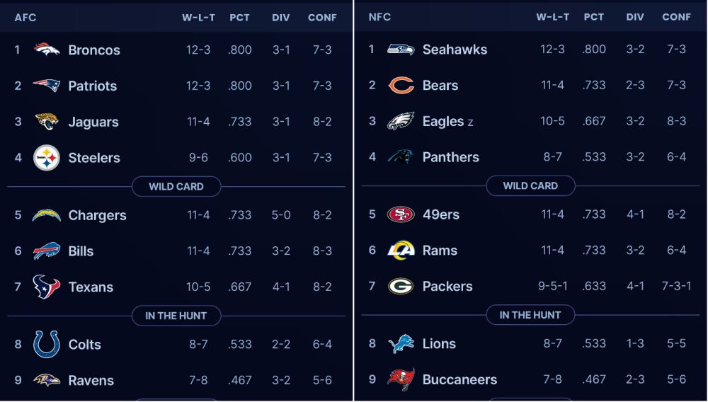 NFC: Seattle Seahawks (12-3), Chicago Bears (11-4), Philadelphia Eagles (10-5), San Francisco 49ers (10-4)