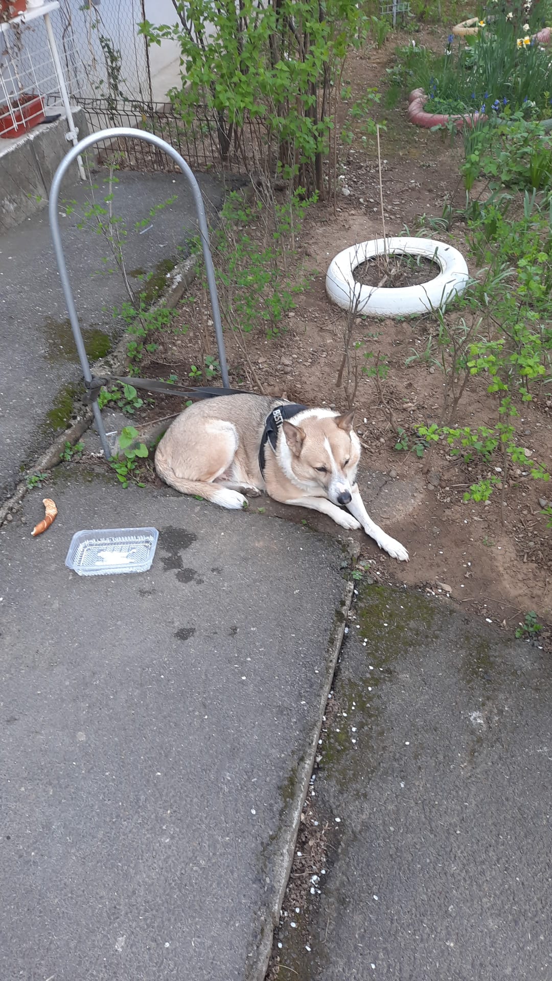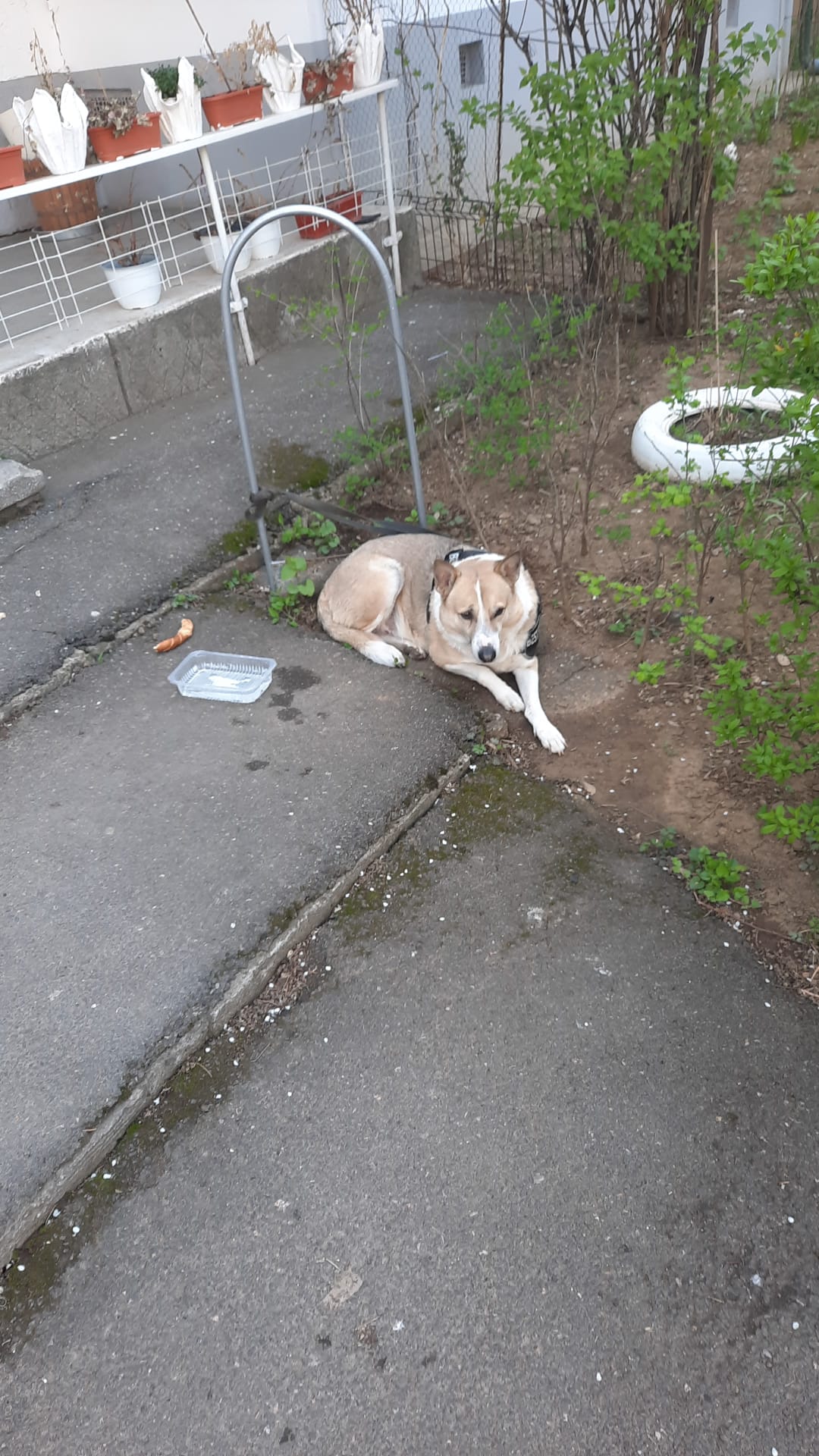 ”Cineva a pierdut acest câine. Poate ne ajutați să îi găsim stăpânul. Bietul animal este în fața blocului 13 Nord de pe Aleea Scorușului nr. 5”.